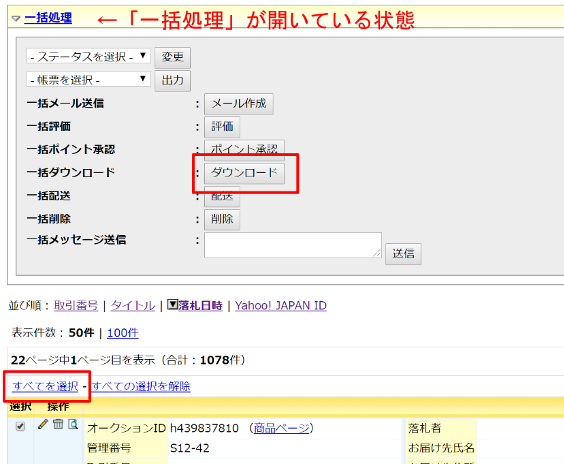 1、落札ナビ「すべて選択」を押し、ダウンロードします。