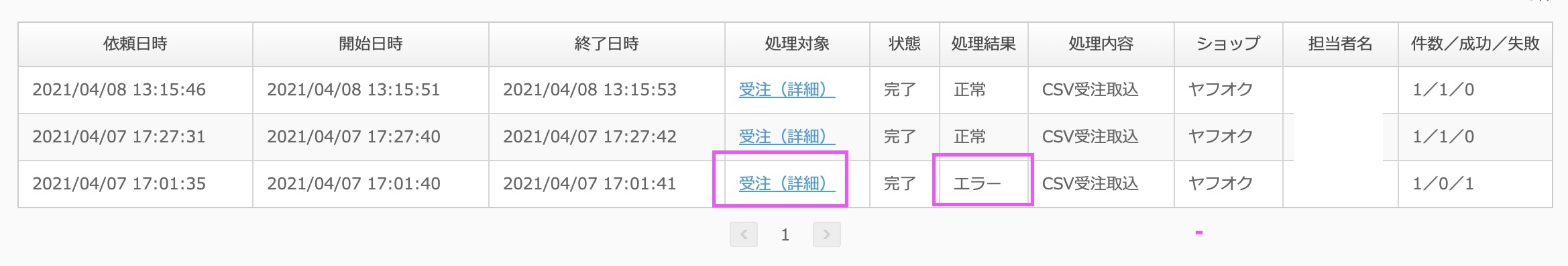 ※処理結果がエラーの場合は「受注(詳細)」リンクより、エラー内容が確認できます。