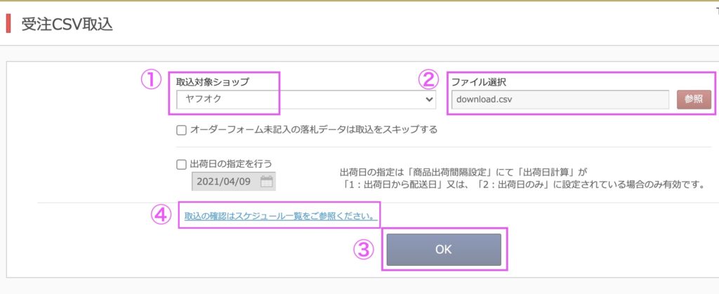 「オーダーフォーム未記入の落札データは取込をスキップする」はチェックしない。