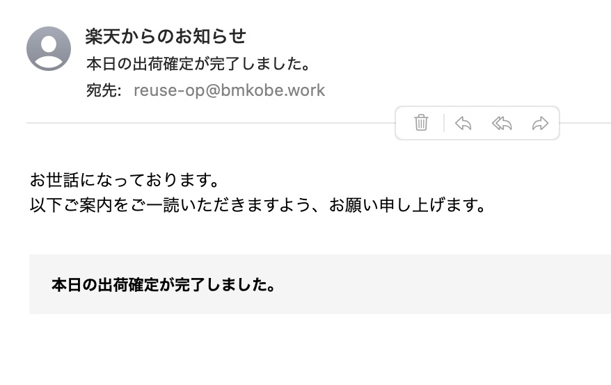 RSLの発送が完了すると、rakuten@bmkobe.workに下記のメールが届きます(先ほど転送設定しました)が、RSLの発送は当日18時までに完了しないことが多いです。