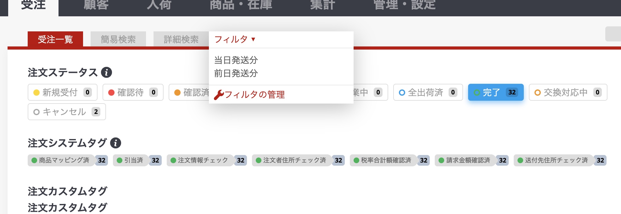 - BOSS > 受注一覧 > 完了 >フィルタ > 当日発送分 or 前日発送分