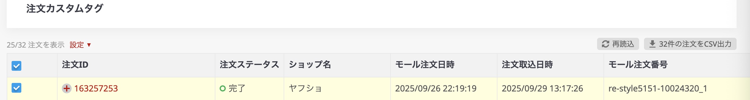 チェックボックスで選択はできないので、フィルタで抽出できない場合は、表示されている注文を全件出力してください。ただし、そのままTEMPOSTARにインポートすると、すでにインポート済みの注文に上書きされてしまいますので、対象外の注文も出力した場合は、必ずインポート前に該当注文を削除するようにしてください。削除の手順は次に記します。
