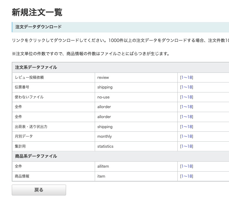 注文データ、商品データ1つずつの計2つ必要です。「allorder」「allitem」それぞれダウンロードしてください。